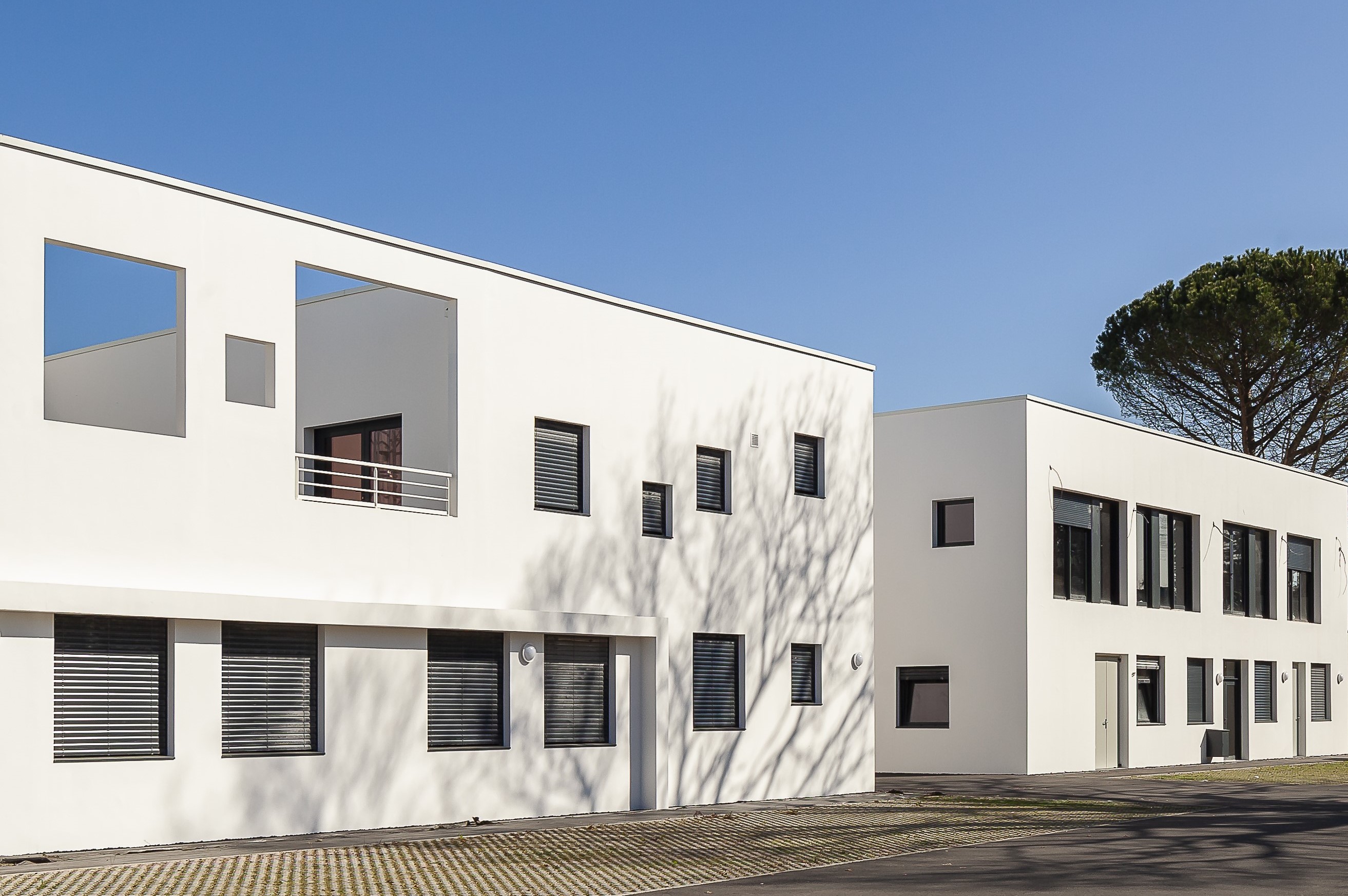 Les deux bâtiments, portés par deux maîtres d’ouvrages différents, sont conçus comme un ensemble immobilier cohérant. Ils se répondent par une volumétrie et une architecture similaire. Les façades vitrées ou supports de signalétiques côté rue, se développent selon une modénature de baies aléatoires conférant aux bâtiments des identités propres.