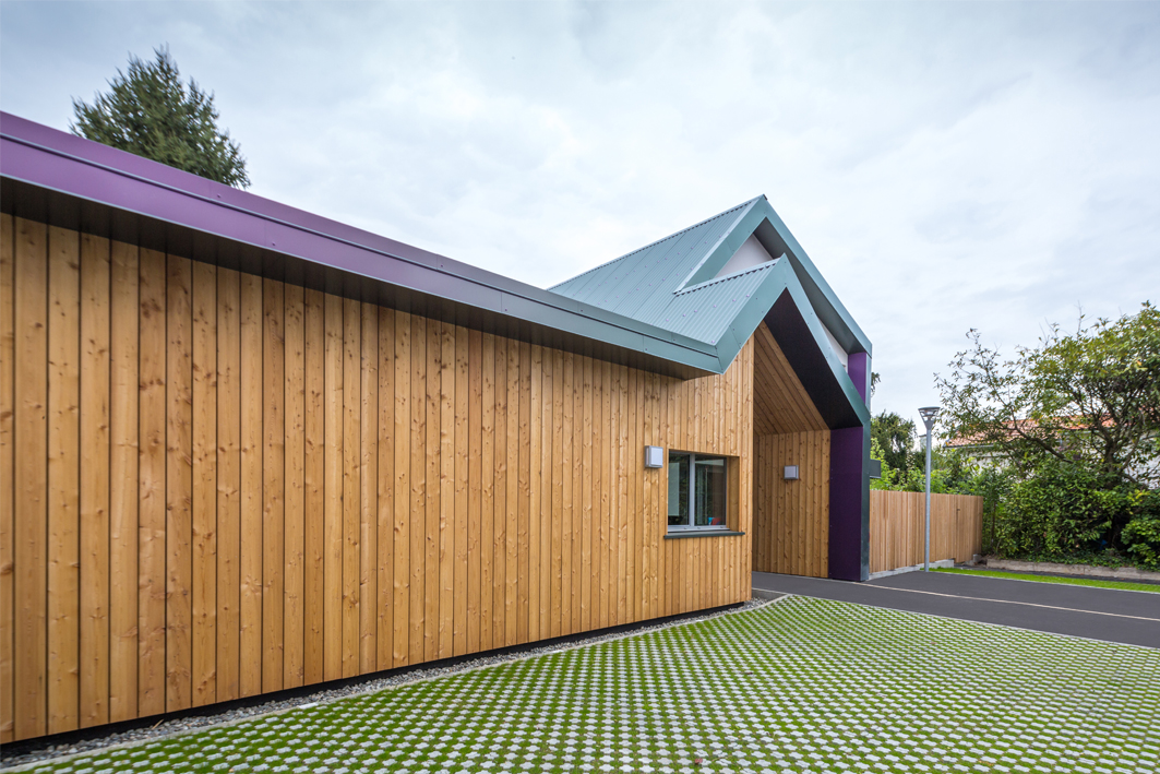 Le bâtiment allie construction traditionnelle en maçonnerie et ossature bois, qui s’exprime en façades avec des bardages sen bois massif et métal irisé aux teintes changeantes. Les couvertures de pentes différentes organisent l’espace intérieur et dynamisent les lignes.