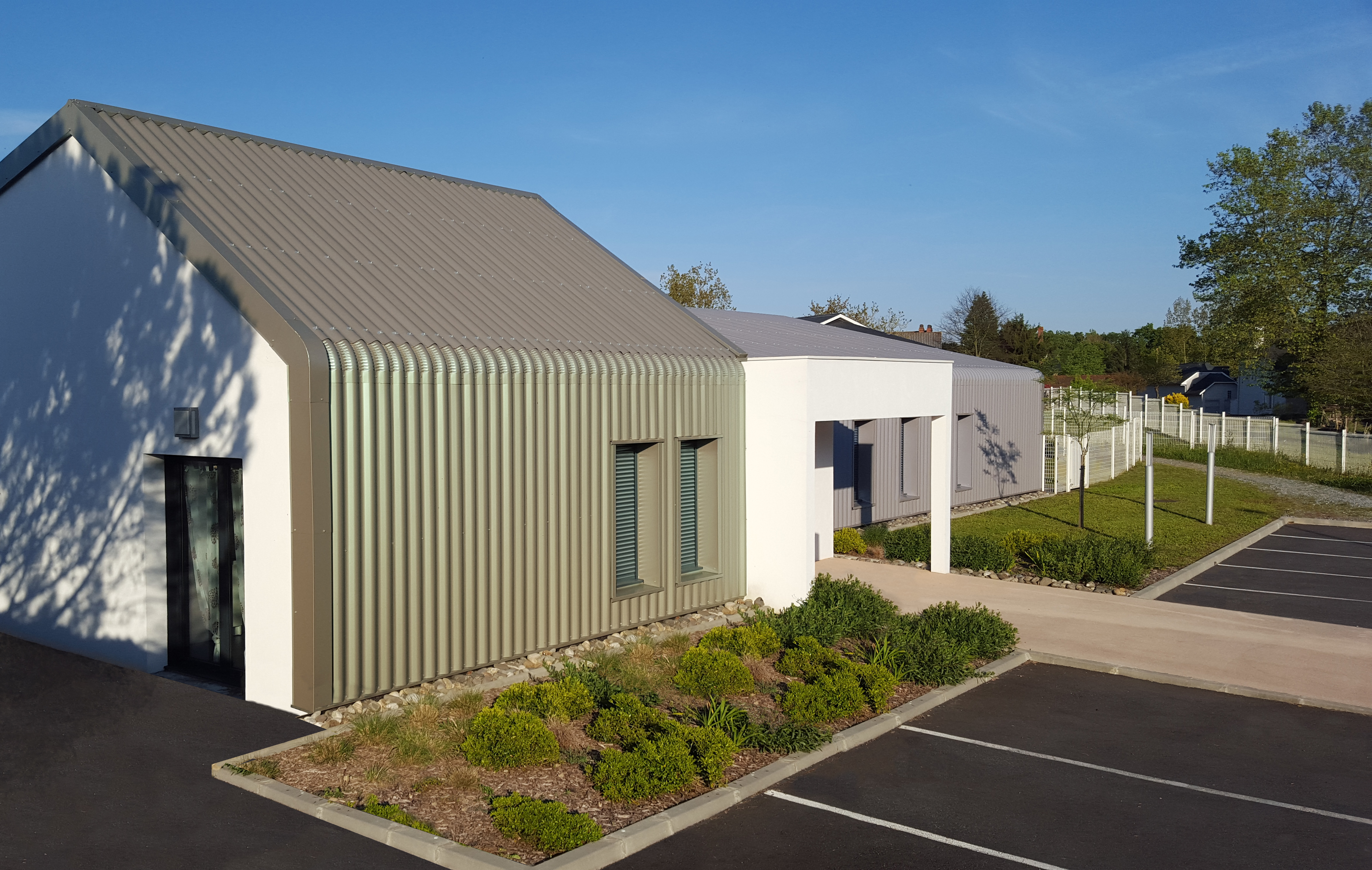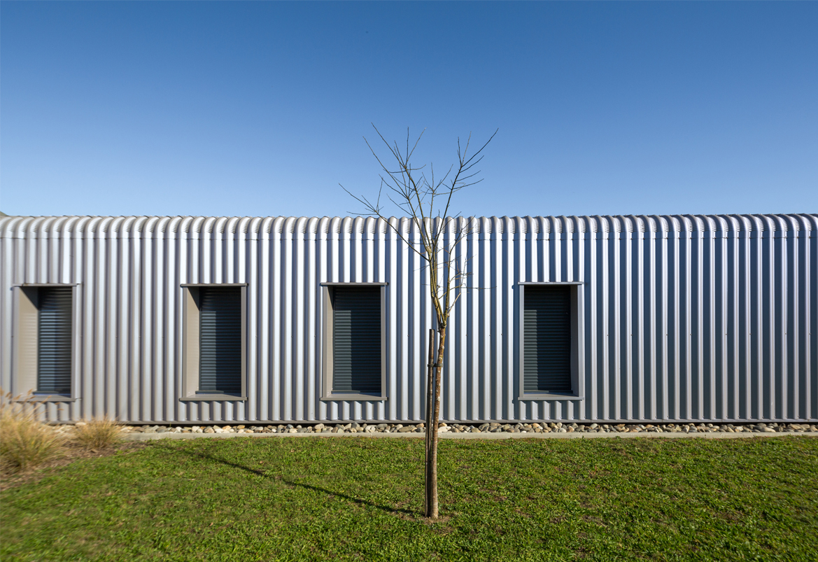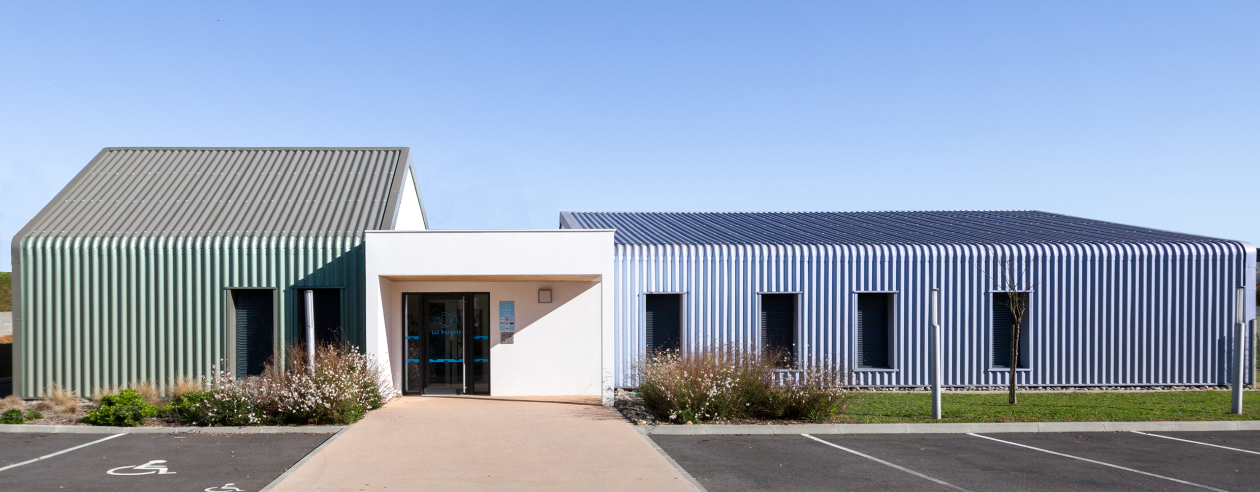 Les matériaux employés en façades et couvertures sont des panneaux en tôle ondulée teintées et irisées, jouant avec la lumière. Ils font référence aux hangars de la zone aéroportuaire proche.