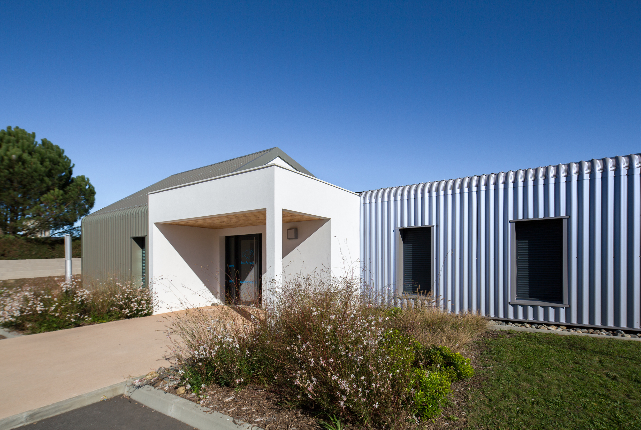 Le bâtiment joue avec les codes de la maison individuelle avec une volumétrie simple et des toitures à 2 pentes déstructurées. Chaque maison abrite des services distincts : pour l’un, les espaces dédiés aux enfants (salle d’activité, coins lecture, change, dortoirs...) et pour l’autre, les locaux de services (bureaux, cuisine, locaux du personnel, ...). Elles sont reliées par un troisième volume en toiture terrasse marquant l’entrée et abritant la salle de restauration qui se prolonge sur une terrasse.