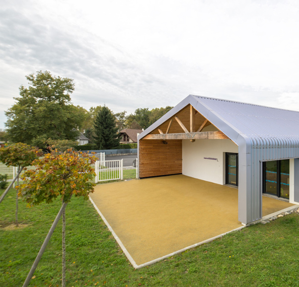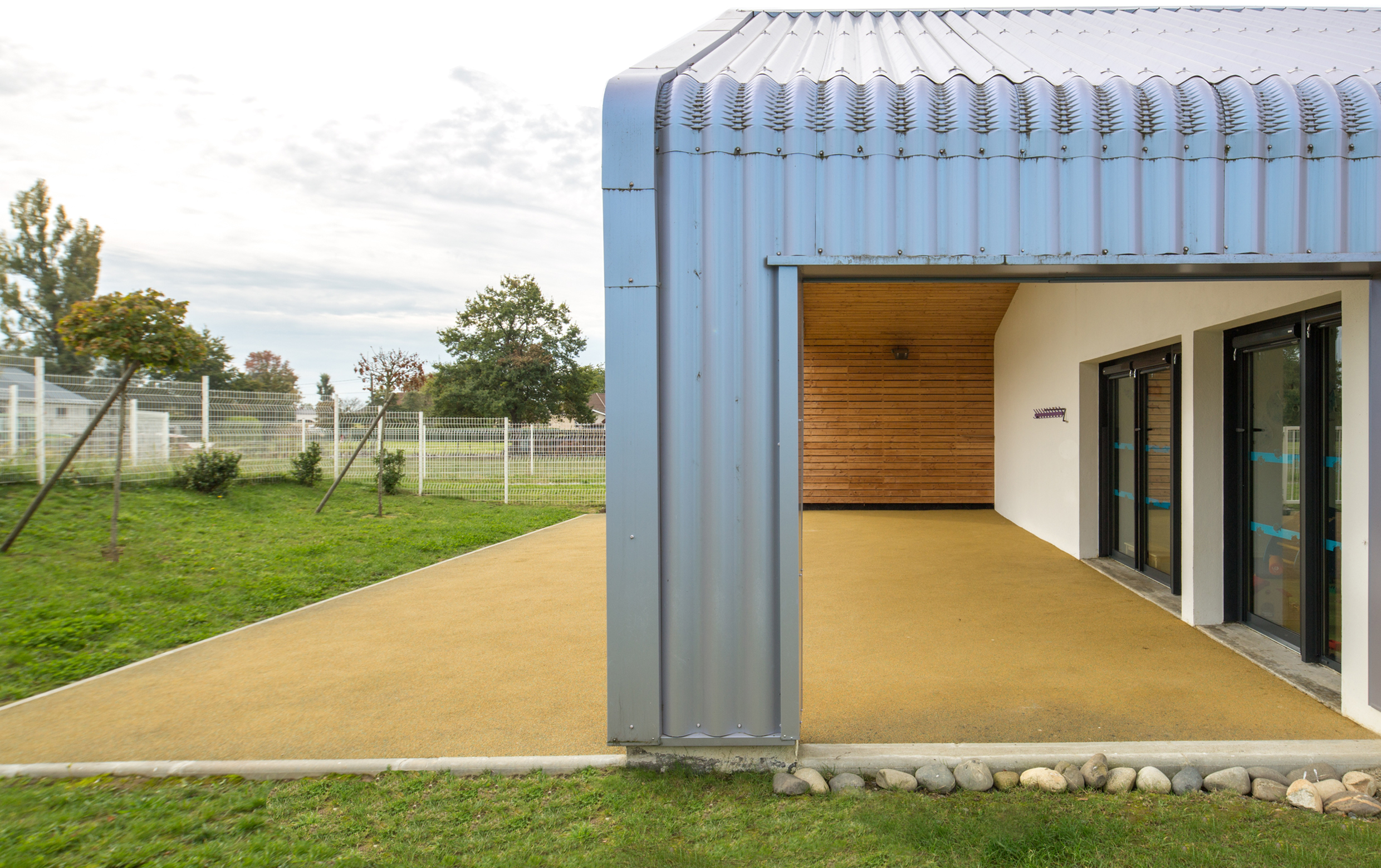 Côté Sud-Est, un large préau prolonge la salle d’activité en une zone de jeu extérieure protégée.